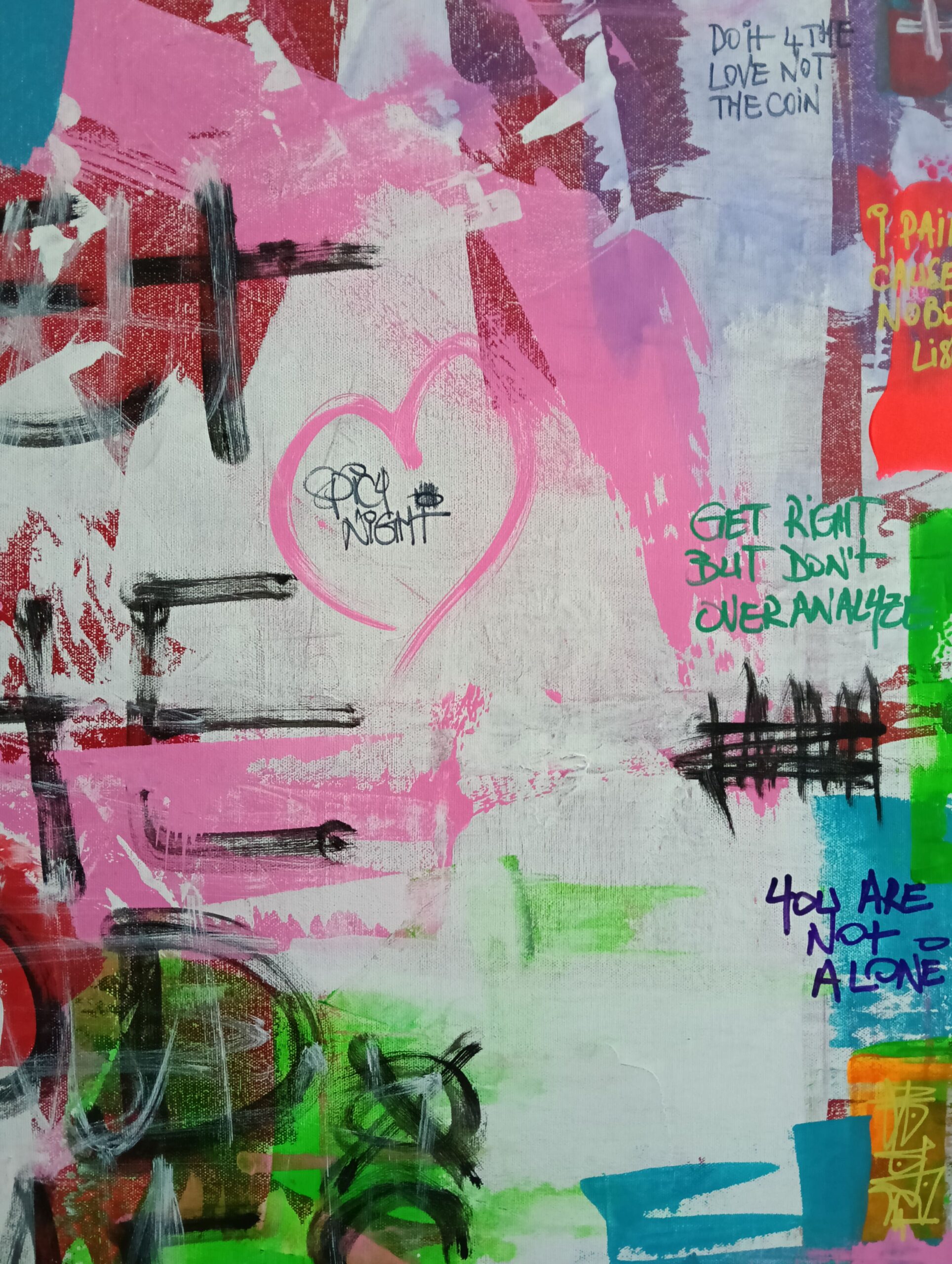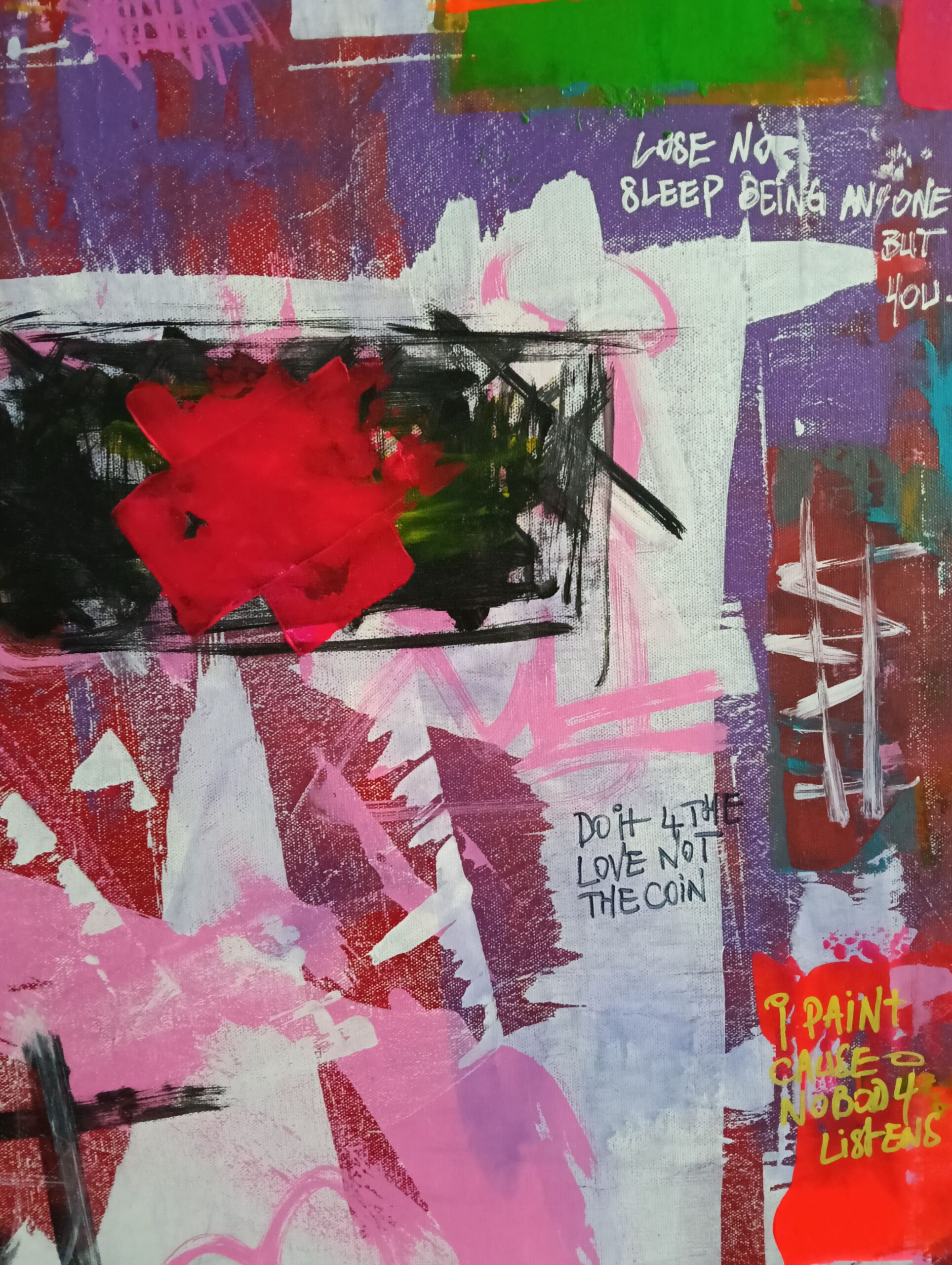“Let the Good Times Roll” bursts with raw energy, vibrant colors, and an unapologetic invitation to celebrate life. This street art piece is a visual party on canvas, blending chaotic layers of pinks, greens, reds, and blues, with rebellious scribbles and thought-provoking messages scattered throughout. It’s a playful clash of freedom and expression, a carnival of texture and meaning that feels as alive as the moments it inspires.