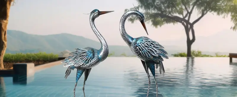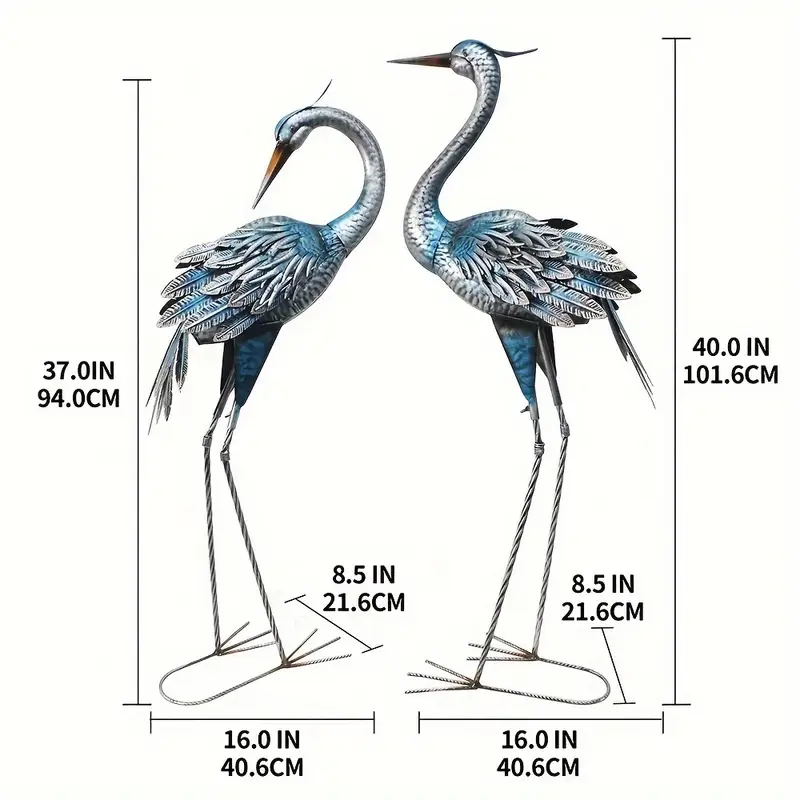 Blue heron metal garden statue—durable outdoor décor for patio, lawn, or backyard; available as set or single, perfect for autumn and holiday decor.