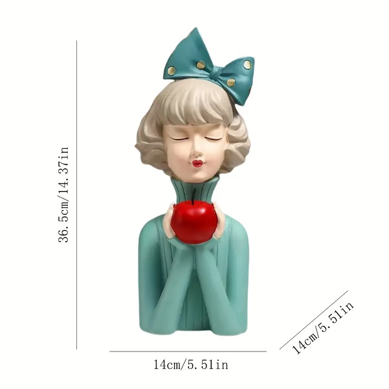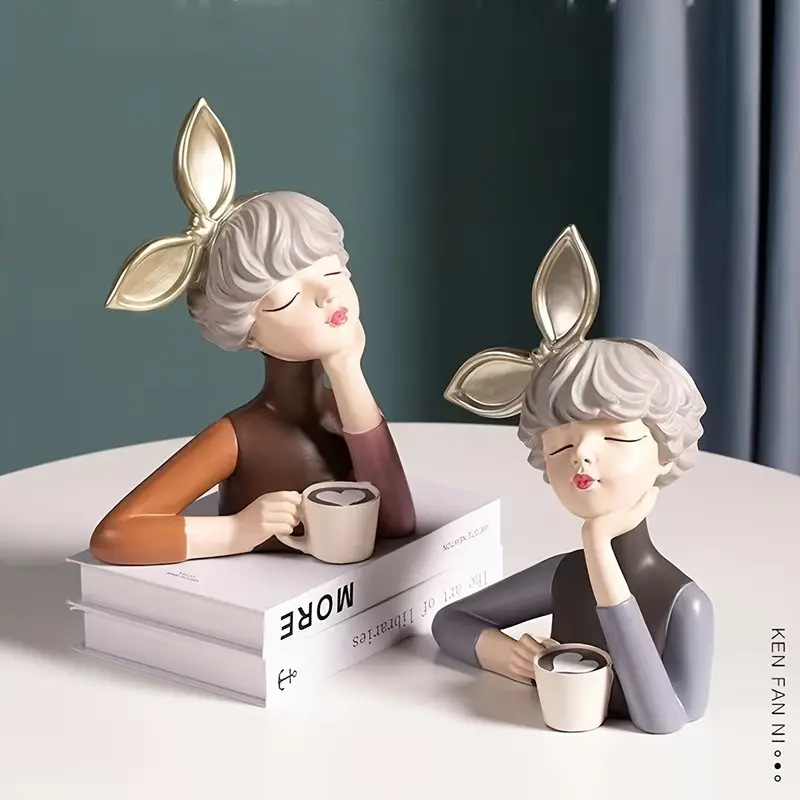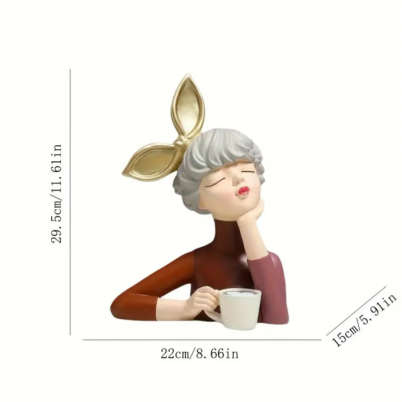 Hand-painted resin Coffee Girl figurine with bunny ears & glasses—contemporary, artistic décor for home, office, or stylish display.